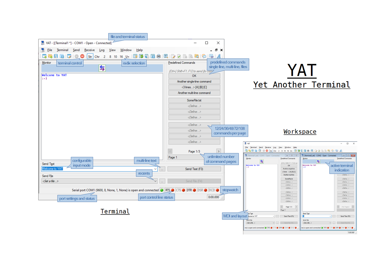 Download YAT for free. Yet Another Terminal :: Serial Communication. Engineering, testing and debugging of serial communication. Supports RS-232/422/423/485 as well as TCP/IP Client/Server/AutoSocket, UDP/IP Client/Server/PairSocket and USB Ser/HID.