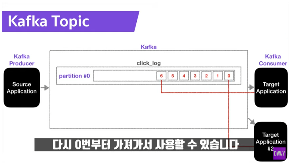 이때 소비자가 새롭게 나타 나면, 이 소비자는 다시 0번 부터 처리 하면된다. 즉, 메시지가 소비된다고 사라지는 것은 아니다. 일반적인 큐가 아닌 형태, 기존 메시지가 보관되어, 새로운 소비자가 나타나도 첨부터 다시 처리할 수 있다.