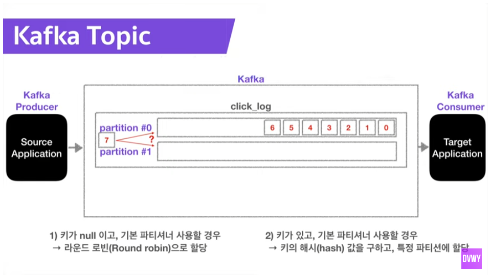 파티션이 하나 늘어나면, 메시지가 각 파티션에 지정해서 넣을 수도 있지만 기본적으로 라운드 로빈 방식으로 메시지가 저장된다.