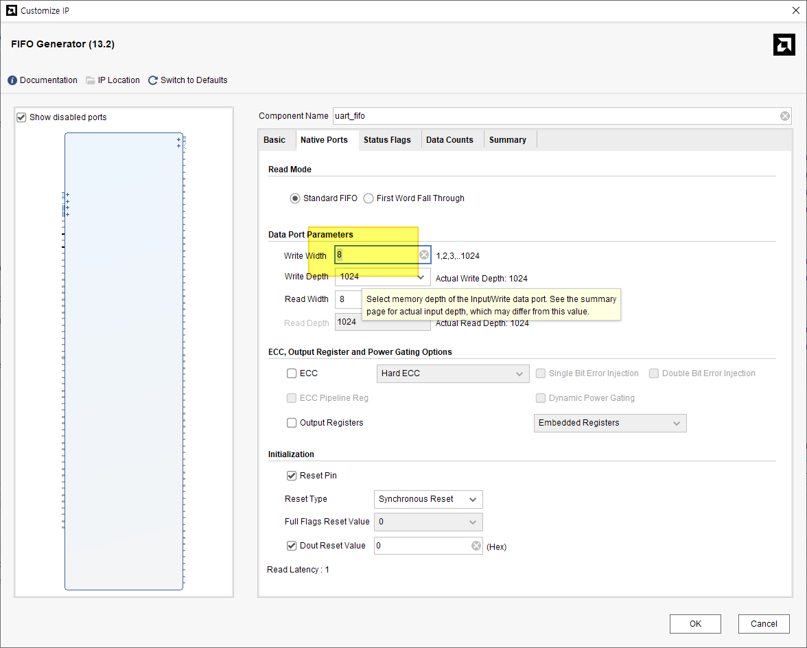 Depth 는 1024 즉 1K Byte 짜리 FIFO를 만들기로 했다.