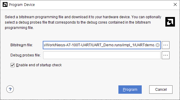 PS) FPGA에 Bit를 올렸다고 사실 끝은 아니다. 왜냐하면 이건 그냥 RAM에 올렸다고 생각하면 된다. 파워 전원을 끄면 다시 깡통이 되는 것을 꼭 인지하기 바란다. 전원이 다시 켜져도 같은 로직이 동작하기를 원하는 사람은 Flash, EEPROM 용 bit를 생성해서 해당 메모리에 구워둬야 한다. :) 기본이니깐 다 알듯