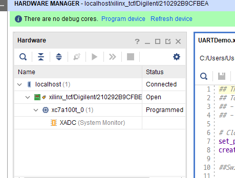 자동 연결을 수행하면, 아래 그림처럼 Xilinx FPGA가 정상으로 연결되었음을 볼 수 있다.
