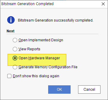 FPGA에 bit를 올리기 위해 "Open Hardware Manager"를 클릭한다.