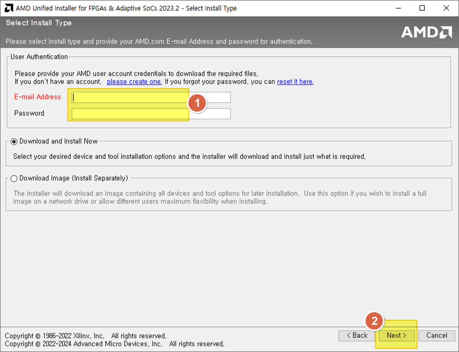 아래 입력창에 자신이 가입한 로그인 정보 입력하고 "Download and Install Now"를 선택하고 "Next" 버튼을 클릭한다.
