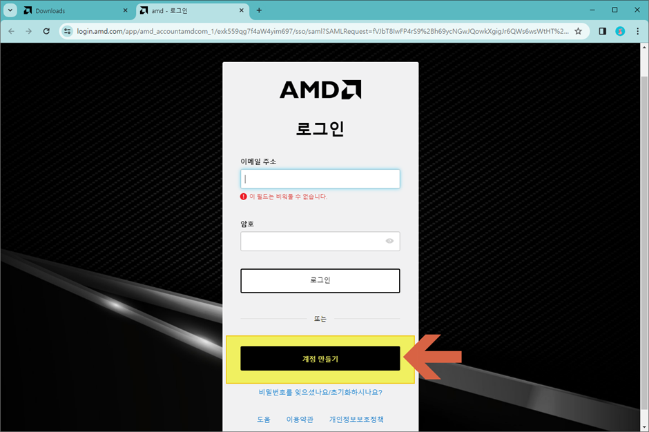 계정 생성하는 방법은 AMD 사이트에서 로그인 버튼은 누르면, 아래와 같이 생성할 수 있는 "계정 만들기" 버튼을 볼 수 있다. 클릭해서 생성작업을 해보자.