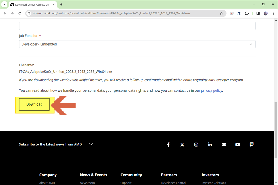 다운로드를 위해서는 몇가지 정보를 AMD사이트에서 요구한다. 해당 정보를 입력하고 다운로드 버튼 선택하면 다운로드 완료된다.