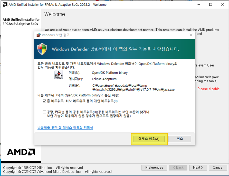 우선, 설치 전에 JDK 방화벽 예외 허용 이라는 팝업이 나타나면 "엑세스 허용"를 눌러 허용하도록 한다.