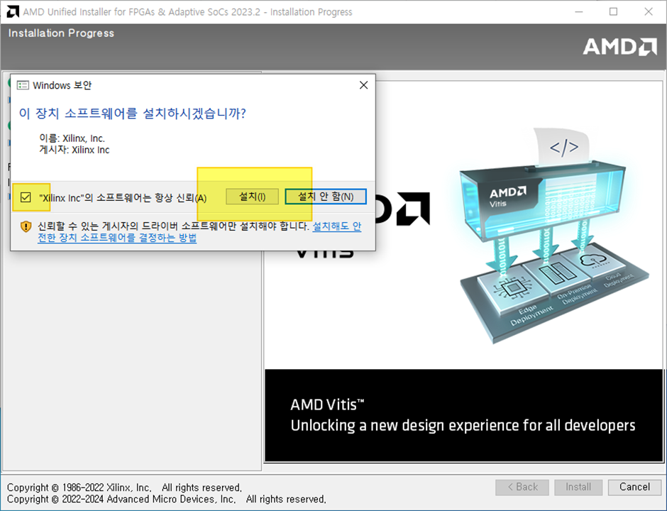 - 설치 후반부 쯤에 케이블 소프트웨어 설치와 관련된 팝업이 나타난다. "설치" 버튼을 클릭한다.