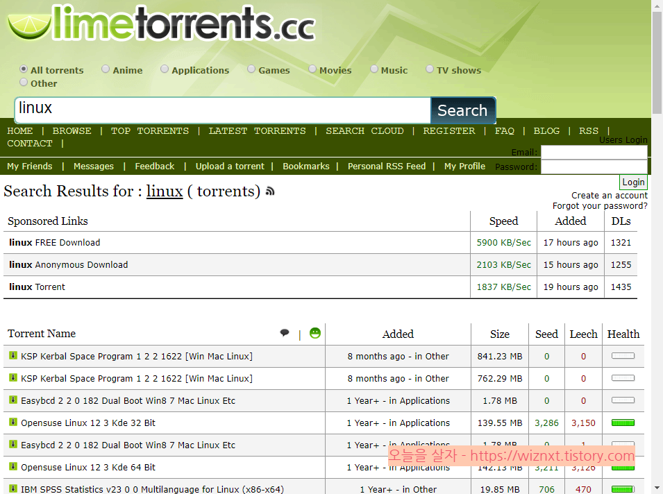사이트이름처럼 깔끔한 라임같은 정보도 많이 있네요. 한글 검색은 불가, 가끔 뜬금없이 광고창이 많이 뜨니 조심하고 사용해야 할 듯. 리눅스로 토렌트 파일을 검색해 보니 아래와 같이 나오네요. 토렌트 파일 검색 다운로드 리스트 맨 오른쪽에 Health 에 녹색으로 표기된 자료를 다운로드 하면 잘 될 듯. 물론 Seed, Leech 값이 높으면 녹색으로 되니 아무거나 참고하셔도 됩니다.
