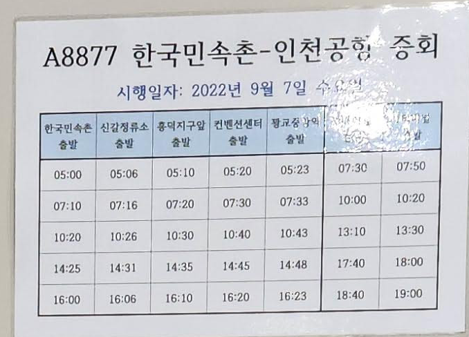 A8877 한국 민속촌 - 신갈 - 흥덕지구 - 광교중앙역 - 인천공항 1터미널 - 인천공항 2터미널 코스로 도는 버스 시간표는 아래 그림과 같다.