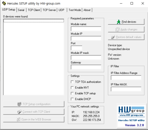Hercules SETUP utility is useful serial port terminal (RS-485 or RS-232 terminal), UDP/IP terminal and TCP/IP Client Server terminal. It was created for HW group internal use only, but today it’s includes many functions in one utility and it’s Freeware! With our original devices (Serial/Ethernet Converter, RS-232/Ethernet Buffer or I/O Controller) it can be used for the UDP Config.