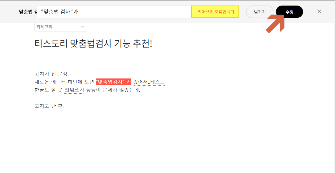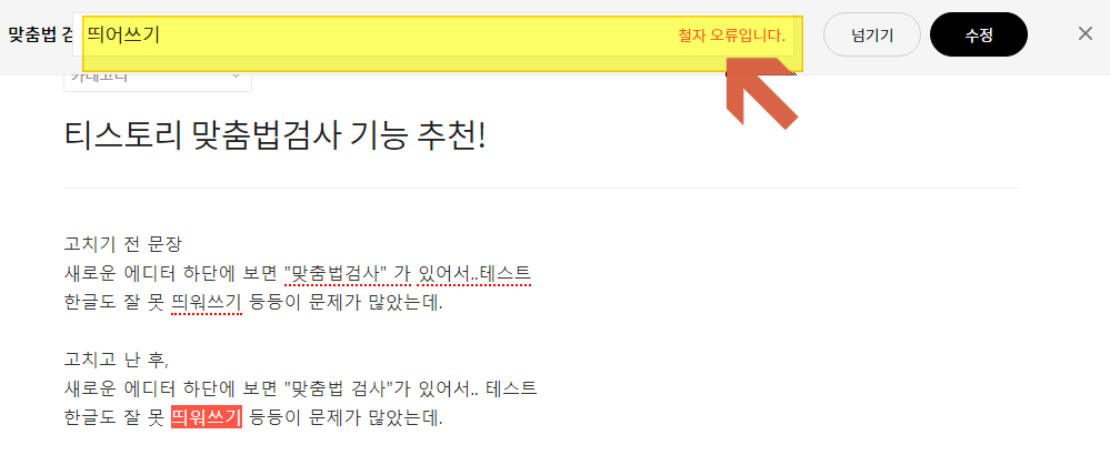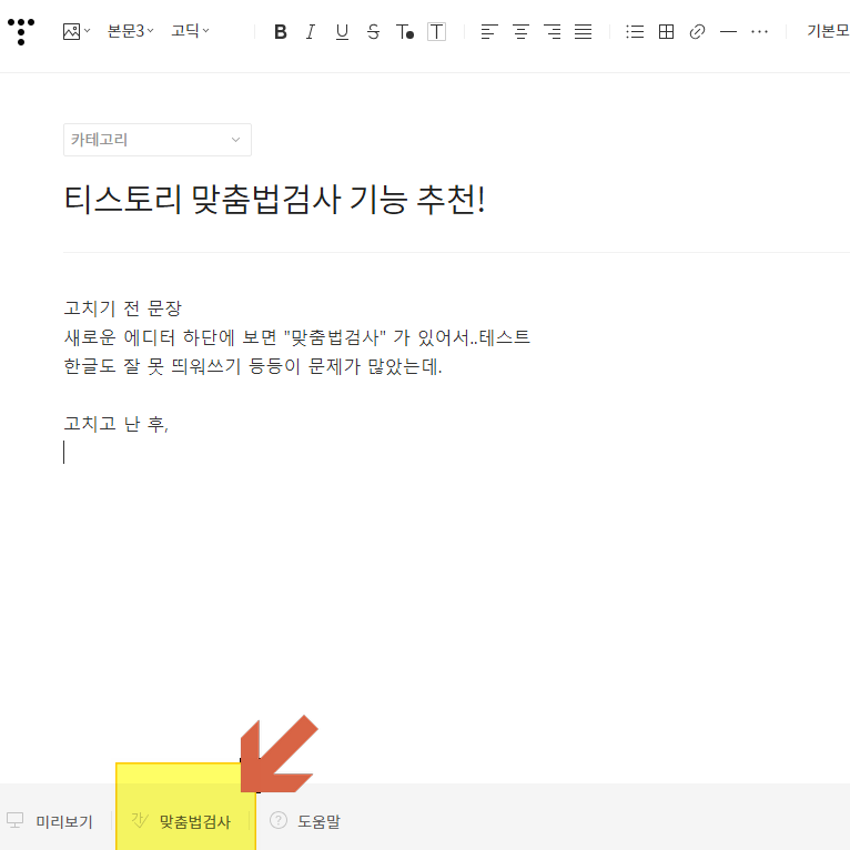 새로운 에디터 하단에 보면 "맞춤법 검사"가 있어서.. 테스트