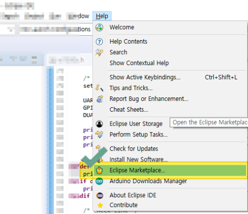 1. Eclipse 설치 후, Eclipse Marketplace… 메뉴를 클릭하고,