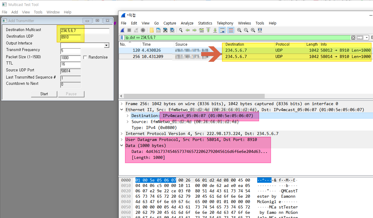 아래 그림처럼, 실제 멀티캐스트 UDP 패킷이 전송되는 것을 확인!!