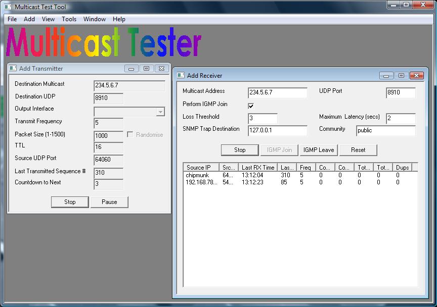 Multicast Tester MCastTest is a utility for testing IP multicast routing on your network. You can add multiple tranmitters and listeners on different IP multicast groups. By running this utility on multiple machines at different points in your network you