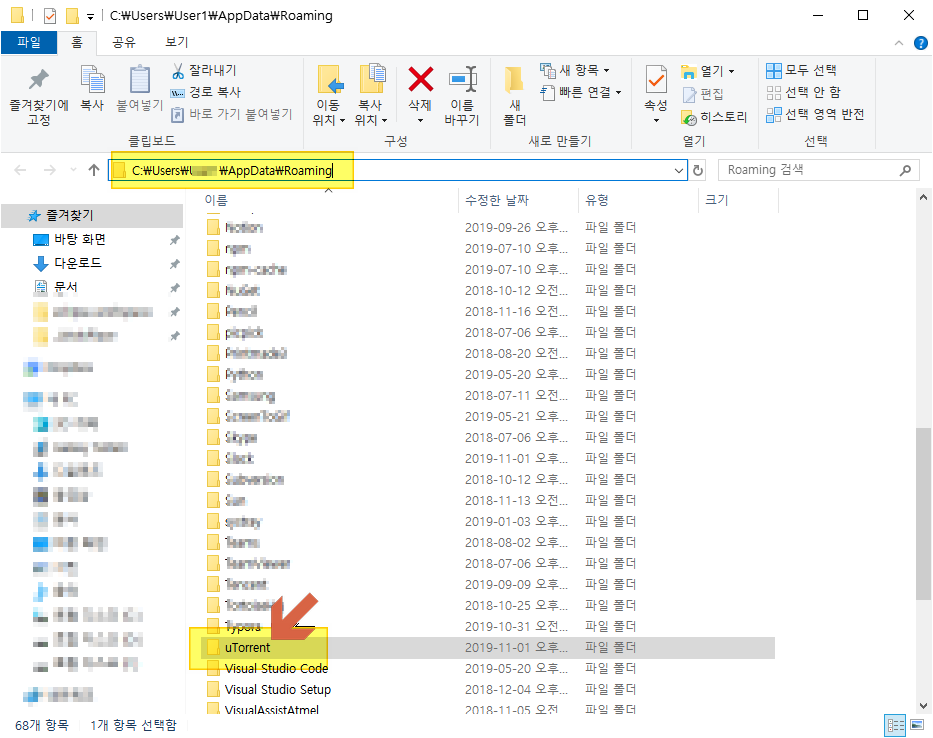 2. 그럼 나타나는 폴더창에서, utorrent 히스토리가 저장된 폴더로 들어가면 된다.
