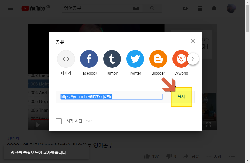 아래 화면처럼, "복사"만 누르면 클립보드에 유튜브 동영상 주소가 복사된다.