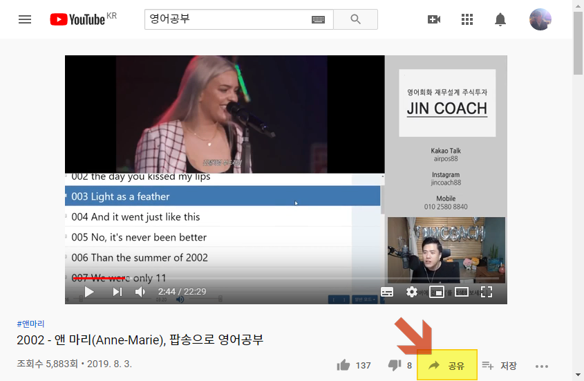 여기서 아래 "공유" 라는 버튼을 누르면 해당 동영상 주소를 쉽게 복사할 수 있다.