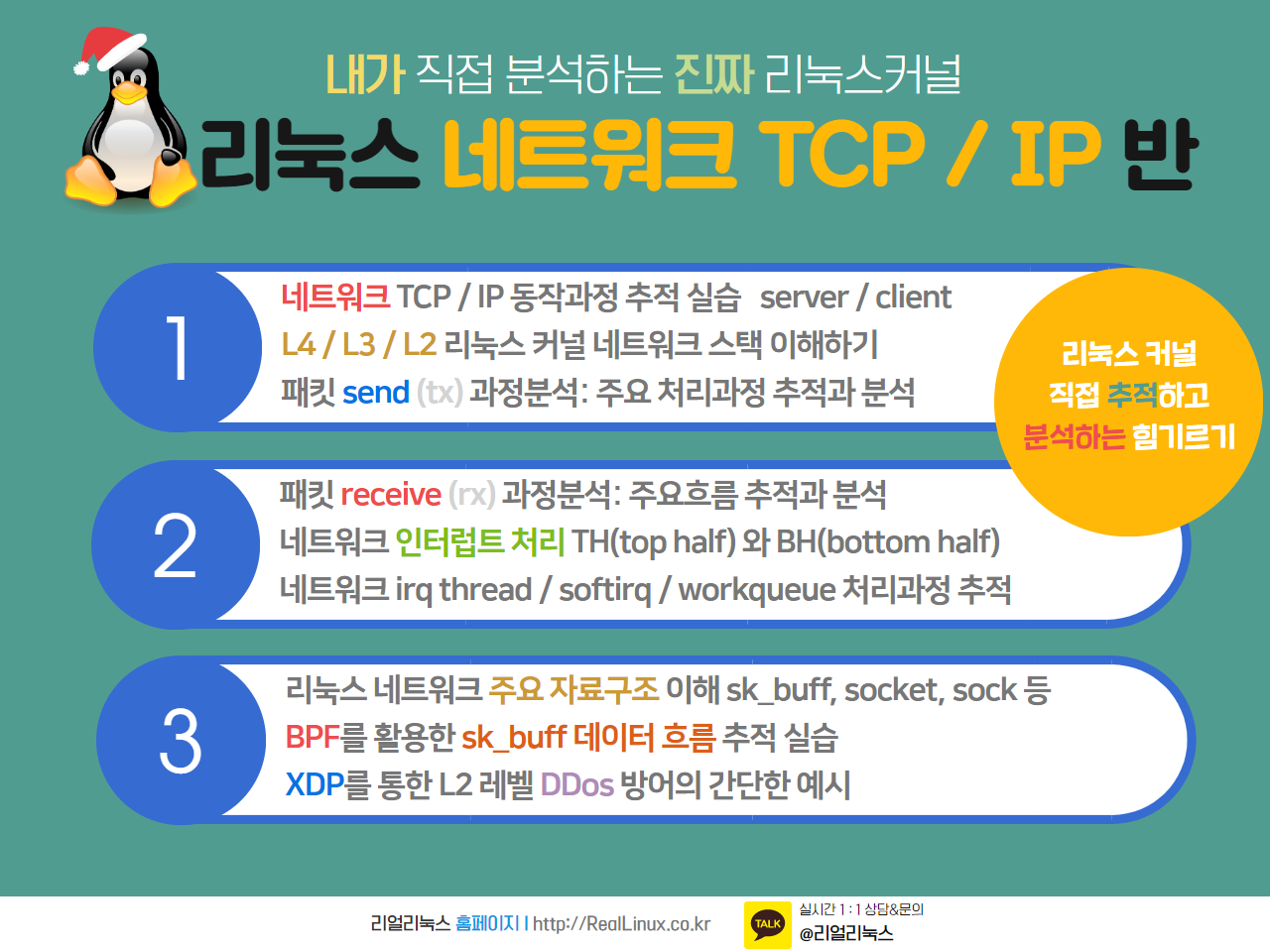 12월 21일(토) ~ 22일(일) 리눅스 OS(커널) 중급: 네트워크 주말특강 2일 과정 (토,일: 12:00-18:00) 리눅스 환경에서 연구하시거나 개발하시는 분들을 위한 강의 입니다. 이미 어느정도 중급수준으로 다루고 계시지만 Tracing 실습을 통해서 분석능력을 기르고 리눅스 커널 내공을 쌓으시려는 분들을 위한 반입니다. 예를 들어 네트워크 TCP/IP 통신이 어떻게 이루어 지는지 ? 인터럽트 처리와 인터럽트 후처리(BH: softirq, wo