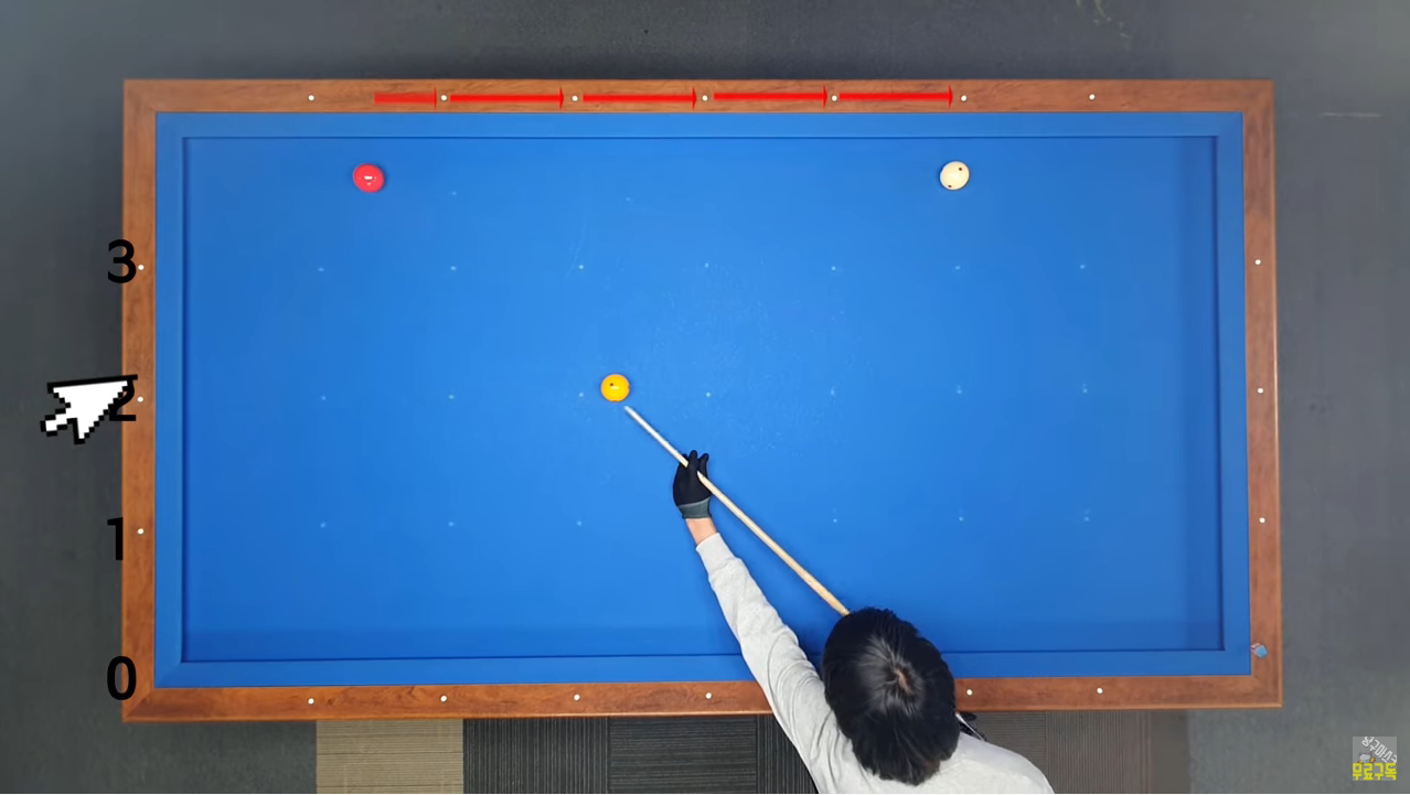 따라서, 노란공이 빨간공을 쳐서 2.5 포인트로 가도록 쳐 주면 맞는다는 얘기다.