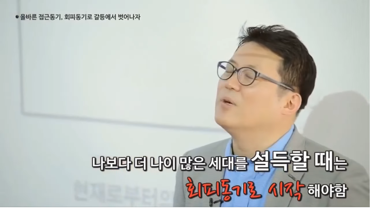 대체로 선배세대와는 회피 동기로 설득을 시작하면 좋고, 어린 후배 세대와의 대화에서는 접근 동기로 시작하는 것이 좋다.