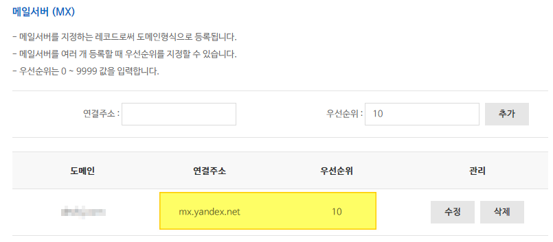 이제, 도메인 이메일 서비스를 사용하기 위해서는 DNS 서버에 설정에 가서 MX 필드를 설정하는 것만 남아 있다.
