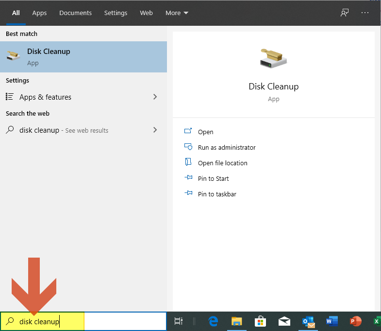 아래 그림처럼 프로그램 검색창에 "Disk Cleanup" 이라고 치면 아주 쉽게 실행할 수 있다. (한글로는 "디스크정리" 라고 치면 될 것 같다.)