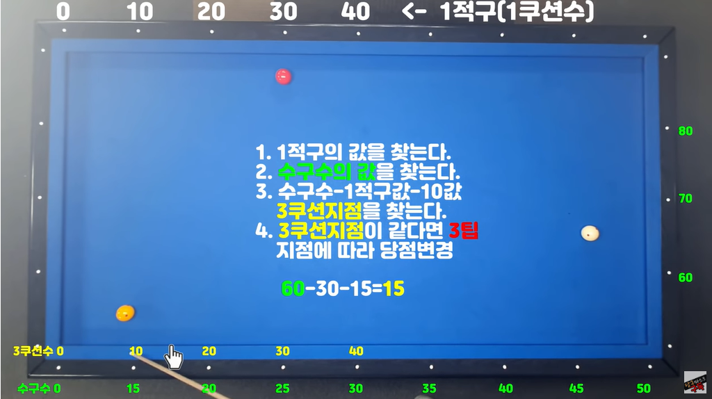 흰색 수구가 50에 있고 빨간색 공을 맞고 들어가는 포인트가 20에 있으니