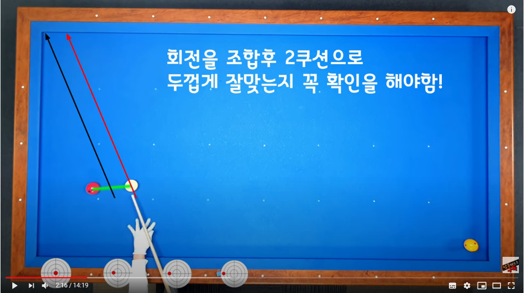 4. 이제 그 검은색 연결 선과 평행하게 수구를 치면 된다. 회전량은 2번에 구한 값을 그대로 사용하면 된다.