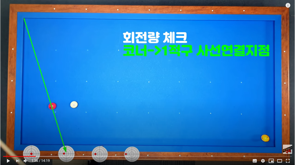 1. 목적지를 정한다. 공이든, 쿠션 위치든 관계없다. 그림에서는 공을 맞추고 싶어서 빨간 공을 목적지로 정했다.