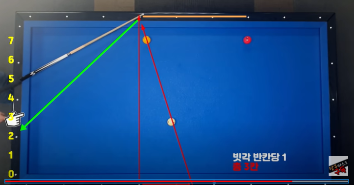 일단 그림처럼, 칸수를 확인 한 다음 1적구에 가까운 45도 라인을 찾는게 핵심이다.