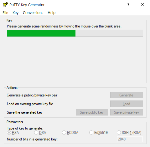 먼저 윈도우 환경에 putty 를 설치하면 같이 들어 있는 PuTTYgen을 실행 시키고 아래 버튼 중 Generate 를 누른다.