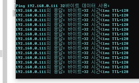 이제 LED도 깜빡이는 메인 코드가 도는 보드에 Ping 을 보내 보면 아래와 같이 정상적으로 동작되어진다.