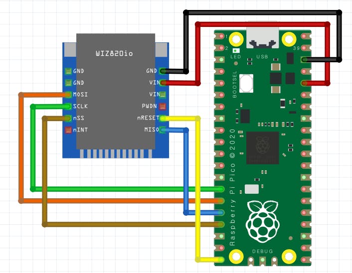 Raspberry Pi Pico 보드와 W5500 내장한 WIZ850io를 하드웨어 연결을 해야 한다.