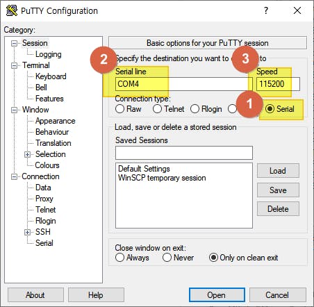 COM 포트를 아래 처럼 확인하고, 속도는 115200으로 오픈하면 된다.