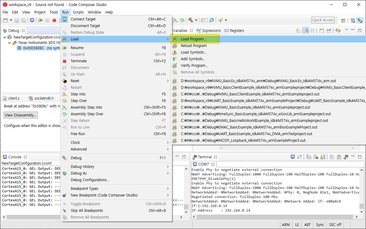 이제 컴파일 빌드 성공한 바이너리 코드를 로드 및 다운로드 해 준다. 여기서는 로드 메뉴가 Run 메뉴에 있다.