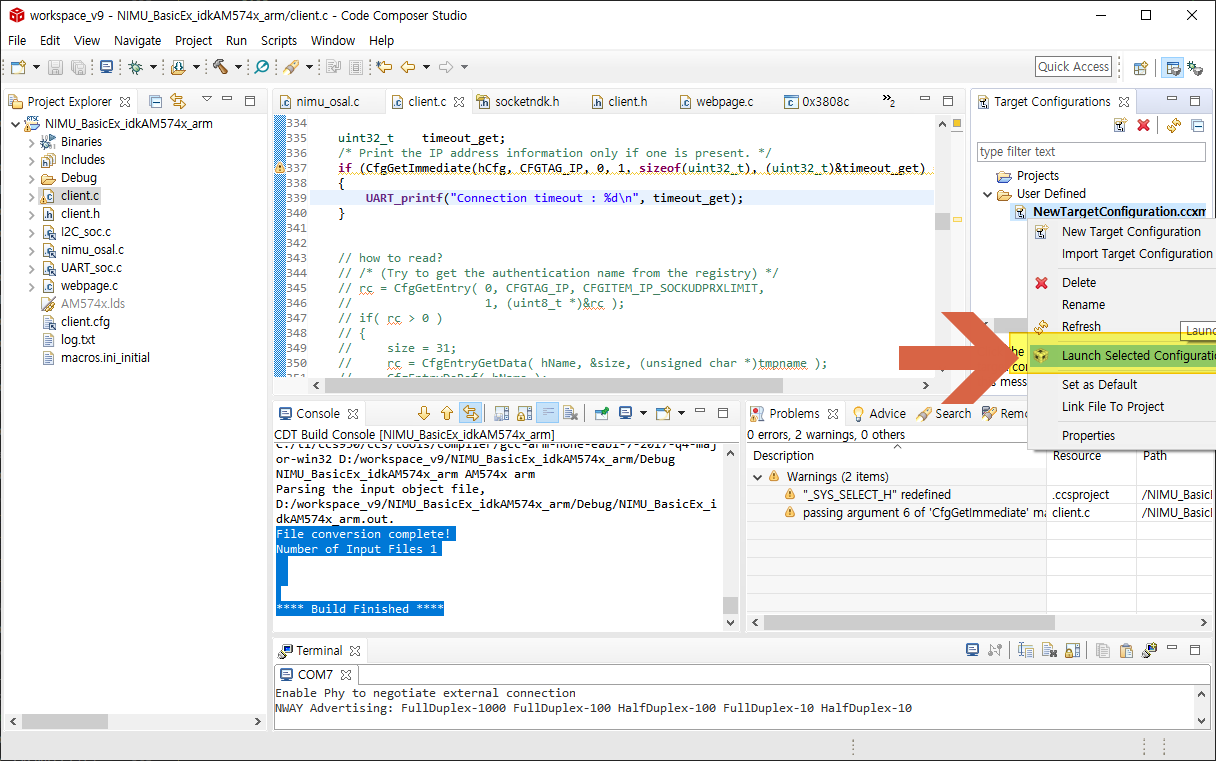 XDS100v2 USB Debug Probe 사용하고 보드 이름에 맞게 IDK_AM574X 선택했다.