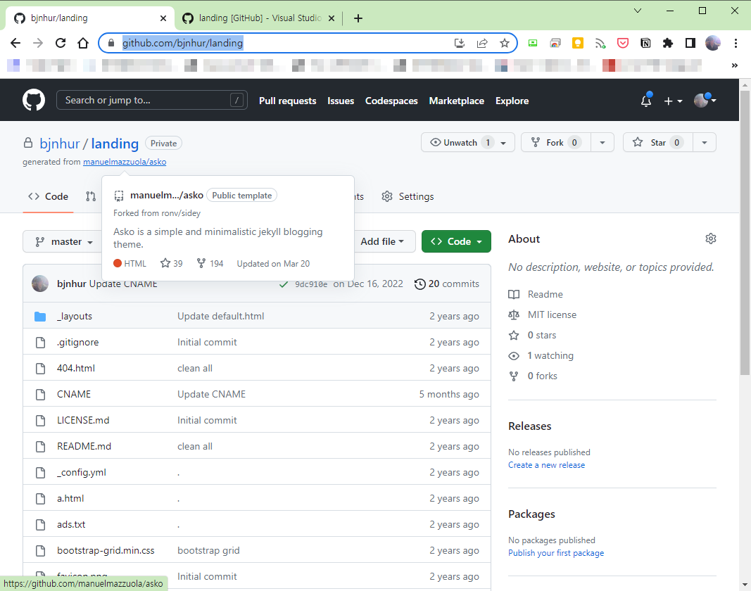 예제를 위해 아주 간단한 지킬 페이지가 있는 Repo 로 접속했다.