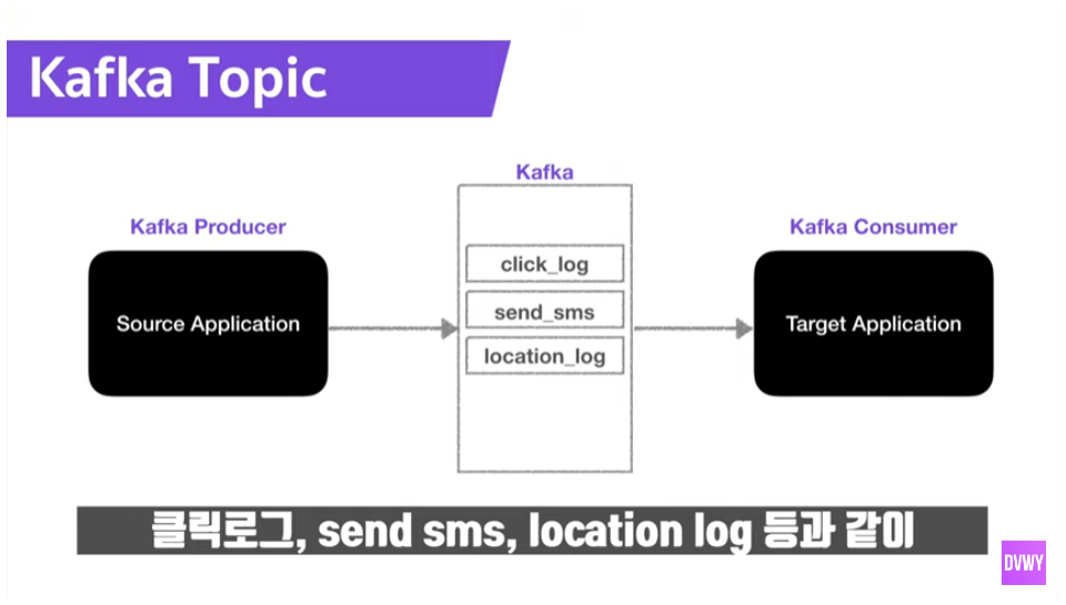 토픽은 어떤 이벤트나 데이터를 저장하는 단위의 제목이다. 아래 예와 같이 클릭로그, 결제로그 등이 토픽이 될 수 있다.