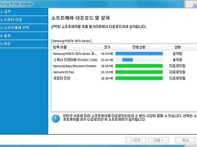 삼성프린터 드라이버 프로그램 설치 - 초보 맨날 하면서 딱 하나로 되지 않는다.이건 머 매번 환경따라 다르니..일단 삼성에서 마법사 같은 설치 프로그램을 제공하고 있어 그나마 편하게 뚝딱 설치 완료 여기를 방문해 보면 끝~~ 프린터 소프트웨어 설치 프로그램 다운로드 (http://www.samsungsetup.com/TS/Client/kr/Install.html) 다운로드 후 실행을 하면,다들 아는바와 같이 "다음" 버튼을 누르면서설치된 환경을 지정하고 (USB인지 Network printer 인지 등등)계속 누르면 아래와 같이 필요한 소프트웨어를 알아서 깔아준다.물론 인터넷에 연결되어 있어야 가능할 듯. 끝. 즐컴~~