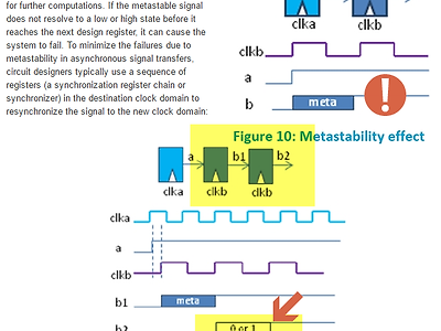 이전글에 이어 하나더, ASIC 설계시에 가장 중요한,실제 합성 후의 이상한 현상이 발생하는 경우 가장 많이 의심하는 이부분 CDC 설계에서 기본적인 것이라 볼 수 있다.그림으로 설명이 가능하다.물론 원본글은 아래 글에 방문하여 전체를 읽어 보는 것이 좋다. https://electronicsnews.com.au/best-design-practices-for-high-capacity-fpga-devices/ 무작정 다른 클럭의 시그널을 보고 사용하는 경우 Meta 상태의 값을 레퍼런스 할 수 있으므로이후 동작을 보장할 수 없다. 경우에 따라 다른 상황이 발생할 수도 있고, 잘 동작할 수도 있다. 운좋게.. 무튼, 그래서 무조건 F/F 2개 정도를 clock domain 사이에 넣어주는 것이 일반적인 기법..