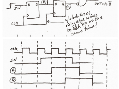 머 제목부터 어렵다.정하기가..국어가... 왜 - 시나리오어떤 신호가 '1' 인 상태로 여러 클럭에 걸쳐져 있다.그런데 나는 '0' 에서 '1'로 올라간 이벤트를 알려주는 것처럼 한 번의 사건에 한 클럭만큼의 이벤트 펄스를 만들기를 원한다.해결은 그림으로이렇게 하면 된다. 즉 그림의 OUT 신호를 보고 사용하면 해결~~그림은 남이 그린 것이므로 원본글의 위치를 알려드립니다.보시고 HDL 코드도 필요하다고 생각하시면 해당글에 가셔서 꼭 읽어보세요. http://www.boldport.com/blog/2015/4/3/edge-detect-ad-nauseam 즐~~