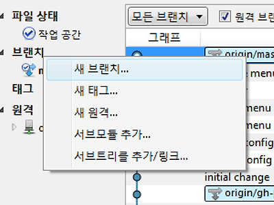 요것 간단하게 마우스 클릭질로 해 보려니 쉽지 않네. 메뉴가 직관적이지 않어 ㅋ 무튼, 함 지워보자고. 필요없는 브랜치 싹 지워버려.. 현재 프로젝트 화면에서, 브랜치란 곳에서 오른쪽 버튼을 누르면, 아래와 같은 메뉴창이 뜬다. 그 어디에도 브랜치 지우기는 없다. 낭패다.. 여기서 그냥 "새 브랜치..." 를 눌러본다. 그러니 짠 아래와 같이 새 브랜치 만드는 메뉴 옆에 떡하니 "브랜치 삭제"라는 곳이 있더군 큭큭 이젠 머 식은죽 먹기..끝 이상~~ 즐 코딩 ^~^