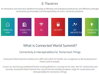 올해 열리는 전시회들 살펴보다가 간단하게 정리. IoT 전시회 in UK 근처UK 에 올해 열리게 될 IoT 전시회 관심 리스트 입니다.눈에 띄는 것은 1번 행사네요. 1. Connected world summit 2018n http://connectedworldsummit.net/n Europe's Leading Event Discussing Connectivity, Security & Interoperability For Tomorrow's Thingsn London, UKn 25 – 26 Sep., 2018n Connected Home Summit, Smart Cities Summit, 5G Summit, Connected Security Summit, IoT Architecture Summit, ..