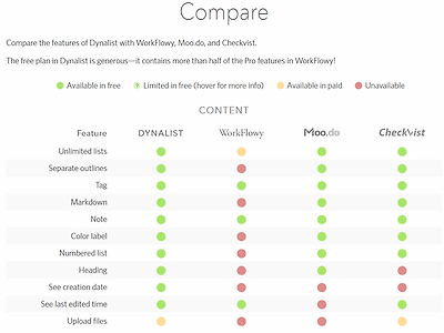 일정 리스트 관리는 workflowy 대신에 Dynalist 일단은 후발 주자가 서비스가 좋아. 조금 더 무료로 많이 누릴 수 있으니 옮겨 쓰자. Import 기능은 있으니 걱정 말고. 리스트 개수 제한도 없고, 리스트도 여러 개 만들 수 있고 여기는 Markdown 문법을 그냥 쓸 수 있어 편하고 나중에 Export 해도 활용하기 좋겠다 나머지 장단점 표는 자기네들 자랑하는 홈페이지에서 살짝 캡처 가입은 여기 아래 링크를 눌러서 https://dynalist.io/invite/PcFgSA