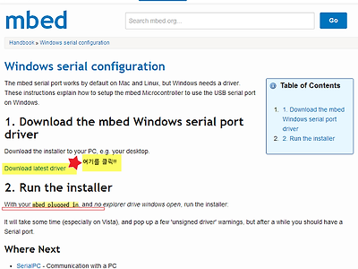 기술관련 자료는 따로 옮겨서 구성하기로..아래 글은 여기 => http://techcafe.tistory.com/53를 참고해 주세요. 일단 글은 남겨둠. 반드시 해 줘야 한다.mbed가 기본적으로 USB2Serial을 제공하고 있으나, 이 드라이버를 반드시 꼭 설치 해 줘야 한다.최소한 나의 경우에는 자동으로 설치되지 않았다. ㅠㅠ 그러나, 여기에 짜짠하고 설치파일이 준비되어 있다.https://mbed.org/handbook/Windows-serial-configuration아래 그림처럼 창이 뜨고, 별표있는 곳을 클릭하면 다운로드~~~~~, 첨부파일까지 가져다 놓자. 이게 머라고, 그냥 실행시키면 된다.보드를 켜두고, USB 연결해 놓고 설치한다. 이놈이 설치하다가 보드를 찾는다. 이제 아래 코드로..
