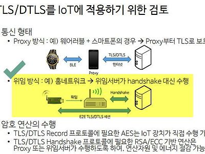 IoT 경량 보안 프로토콜 - DTLS 한글 자료 모음 먼저, 고민하는 것을 아주 요약적으로 잘 정리해둔 발표자료작성하신 분은 서울대학교 인터넷 융합 및 보안 연구실 - 조은상 (escho@mmlab.snu.ac.kr) 님이시네.원본 글의 위치는 Security Issues in Embedded Devices한 번 조언을 구하면 좋으련만..무튼 인상적인 페이지를 하나 캡쳐해 둔다. (아 혹시 저작권이 문제가 되는 것인지 모르겠네요. 알려주시면 바로 내리겠습니다. 이 블로그가 개인 저장용이라 머 별일이 없겠지만) 위임방식이 아주 많이 현실적인 것 같은 느낌. Full stack이 가능한 node 와 그 아래 위임방식이 가능한 node 이렇게 구분하여 개발이 가능할 듯.요즘은 한계가 너무 느껴져 힘듬......